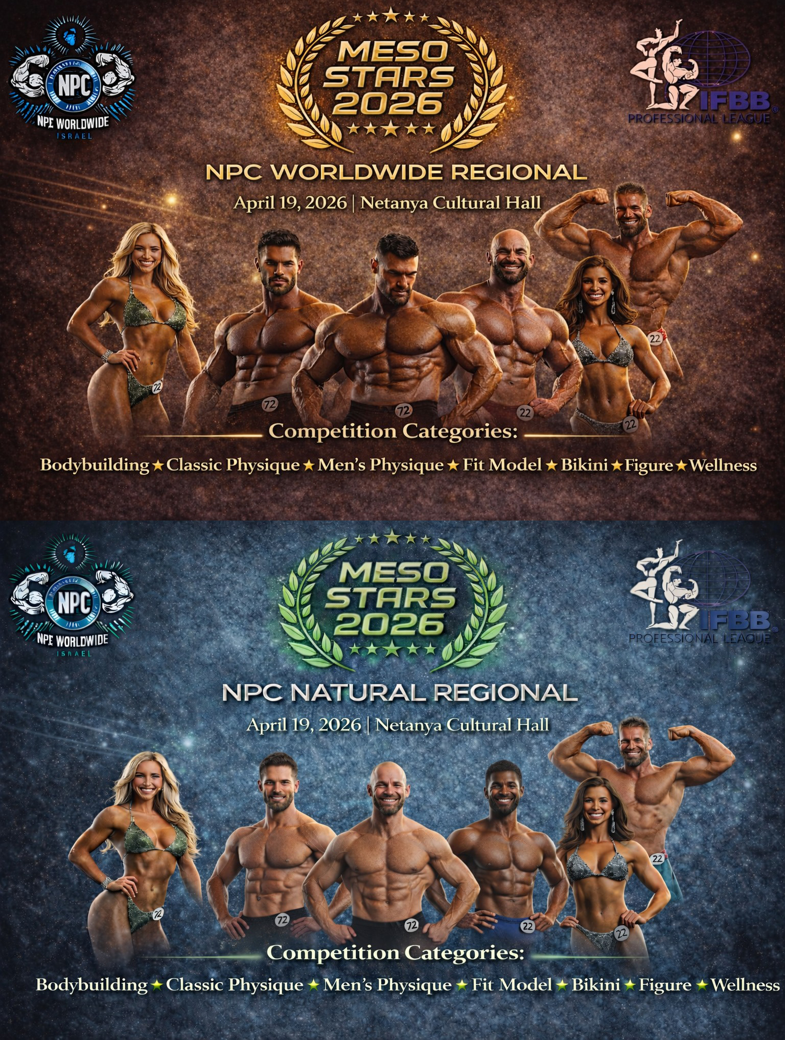 לראשונה בישראל, MESO גאה להיות הנציג הרשמי והבלעדי של NPC - איגוד פיתוח הגוף המוביל בעולם. שיתוף פעולה זה מאפשר לספורטאים ישראלים להתחרות על במות בינלאומיות ולהגשים את חלום להשגת מעמד בינלאומי בפיתוח גוף!